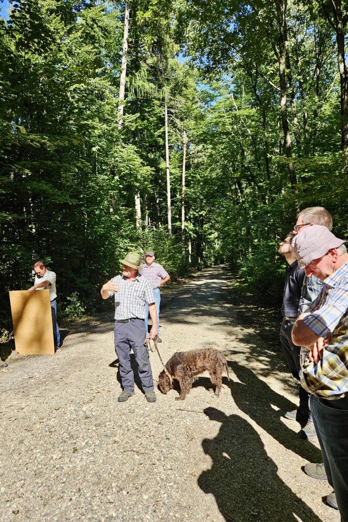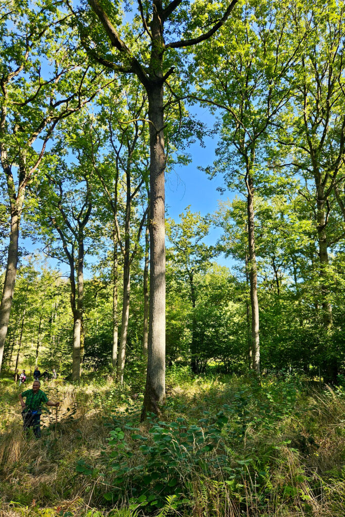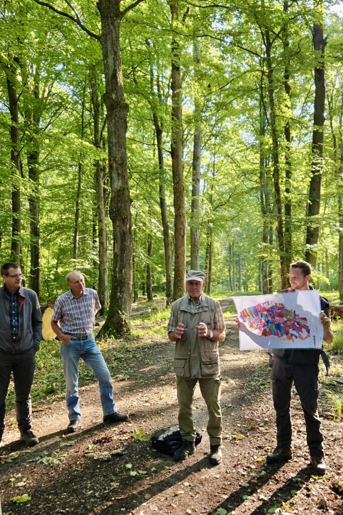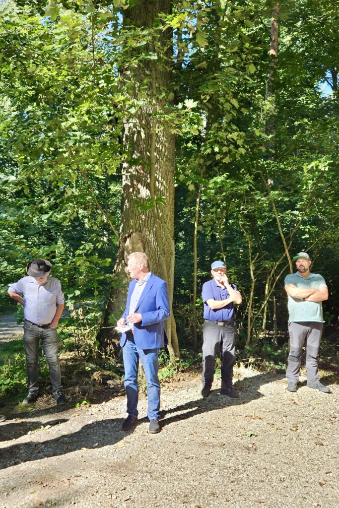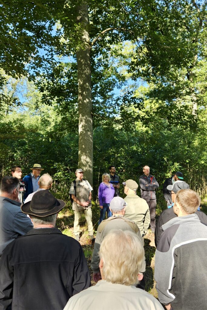 Nach einem gemeinsamen Mittagessen im Hirschen in Tauberrettersheim führte der zweite Teil der Exkursion in den Stadtwald Ochsenfurt. Bürgermeister Peter Juks und Revierleiter Wolfgang Schölch nahmen die Gruppe in Empfang und zeigten, wie im etwa 140 Hektar großen Stadtwald alte und junge Eichenbestände gleichermaßen gepflegt werden. Schölch erläuterte, dass die Eichenverjüngung in den vergangenen Jahren teils vernachlässigt worden sei – nun aber mit viel Einsatz wieder vorangebracht werde. Neben der Eiche setzen er und sein Team auf weitere Baumarten wie Feldahorn, Baumhasel oder Linde, um den Wald fit für den Klimawandel zu machen. Auch hier wurde klar, wie aufwendig Waldpflege ist: Ohne Schutz vor Wildverbiss und regelmäßige Pflege könnten viele Jungpflanzen nicht überleben.